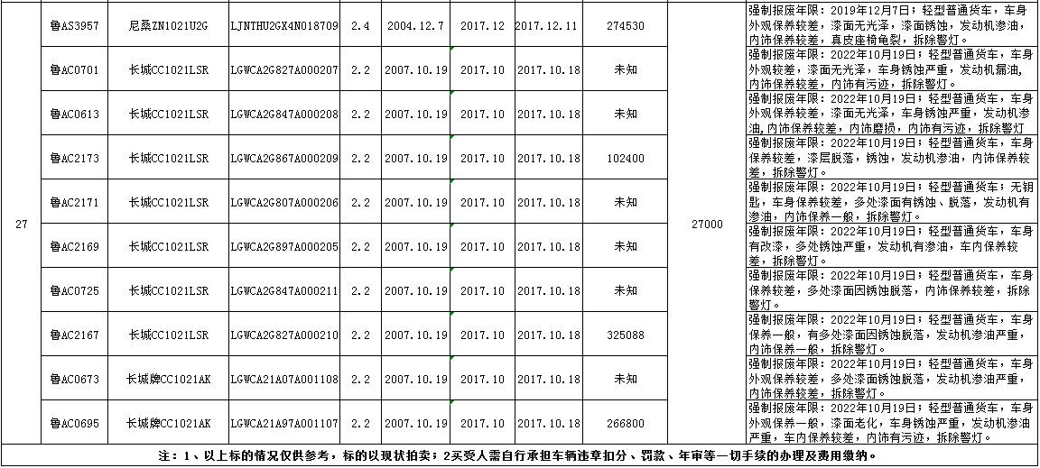 意向競買者請于2017年8月27日16:00之前將拍賣保證金10000元/輛交至以下賬戶(戶名:金諾國際拍賣有限公司,開戶行:齊魯銀行濟南歷城支行,賬號:000000726003800003937),準備有效身份證明(個人:身份證原件及復印件;法人:營業執照復印件)聯系本公司辦理競買登記。