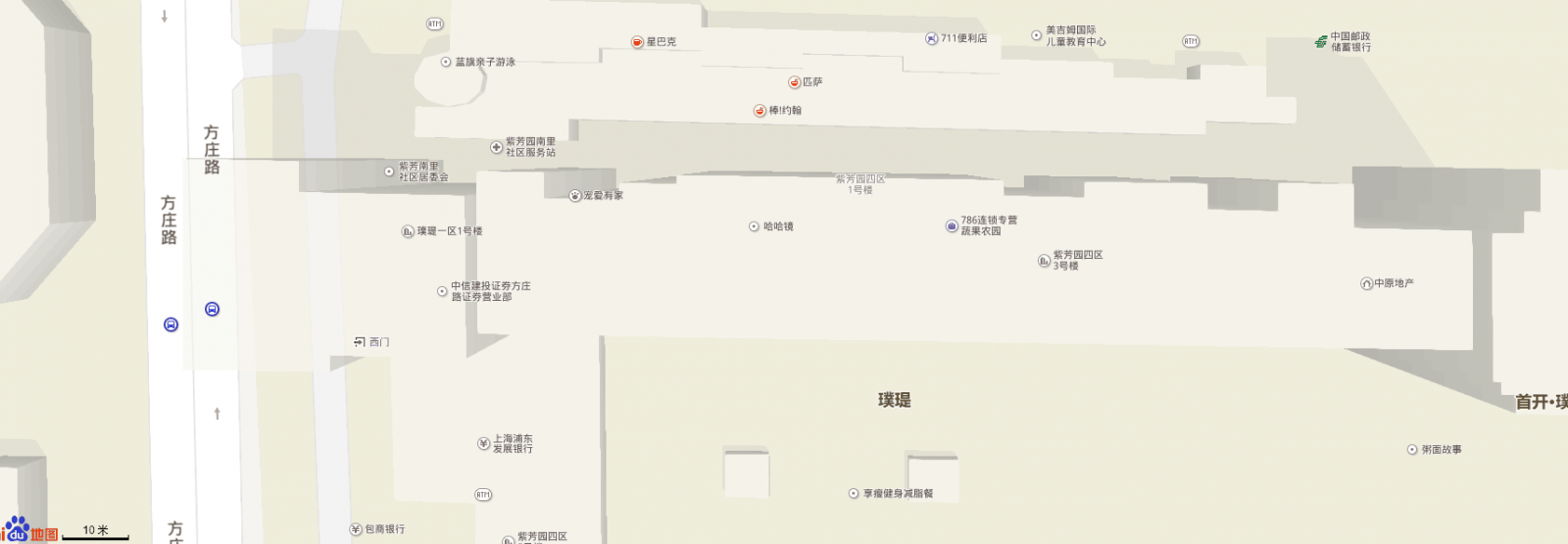 餐飲:方莊著名美食一條街,分布十余家餐館:全聚德、金鼎軒、都一處、順峰、小土豆、金山城、麥當(dāng)勞、肯德基、必勝客、Mr. Pizza等